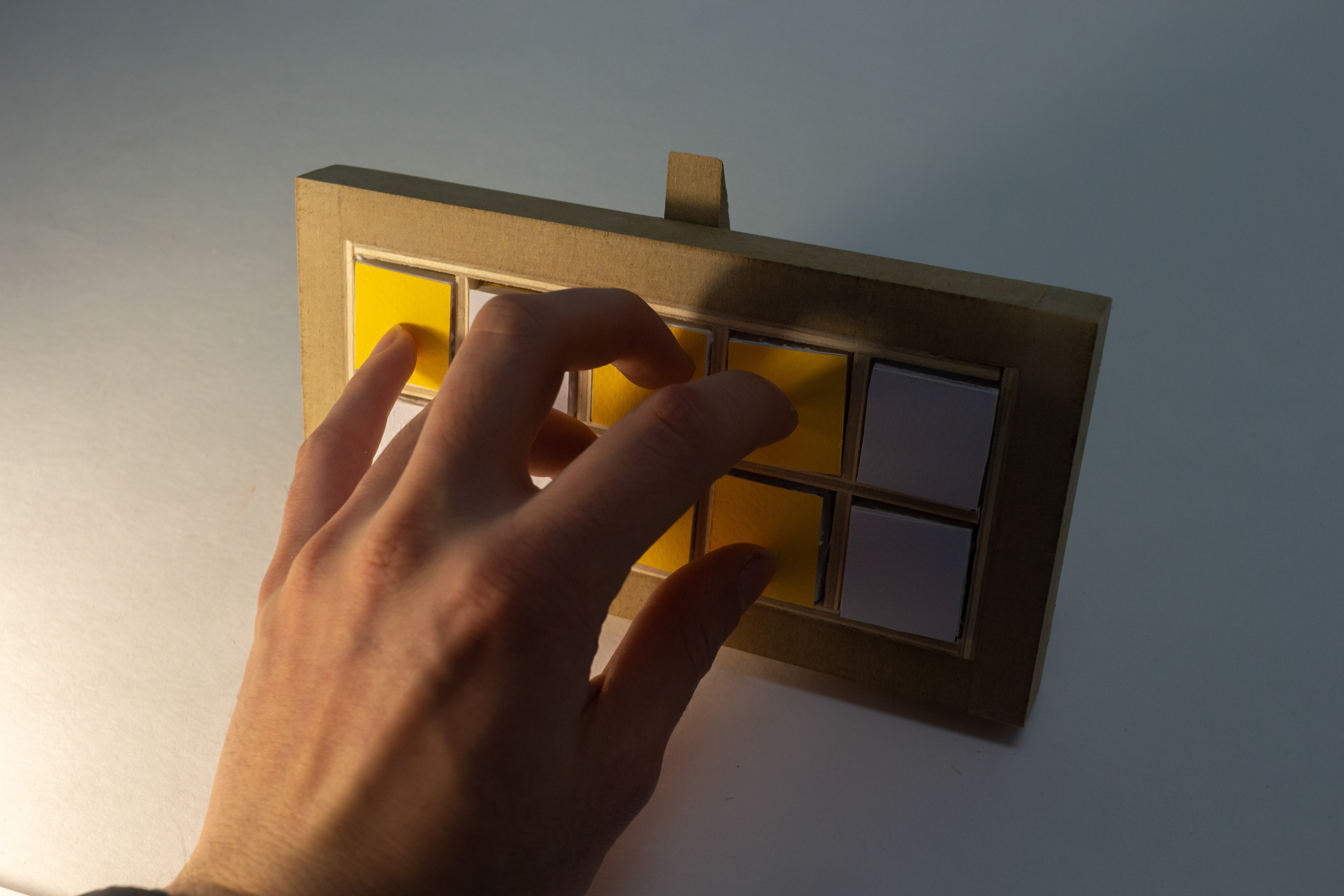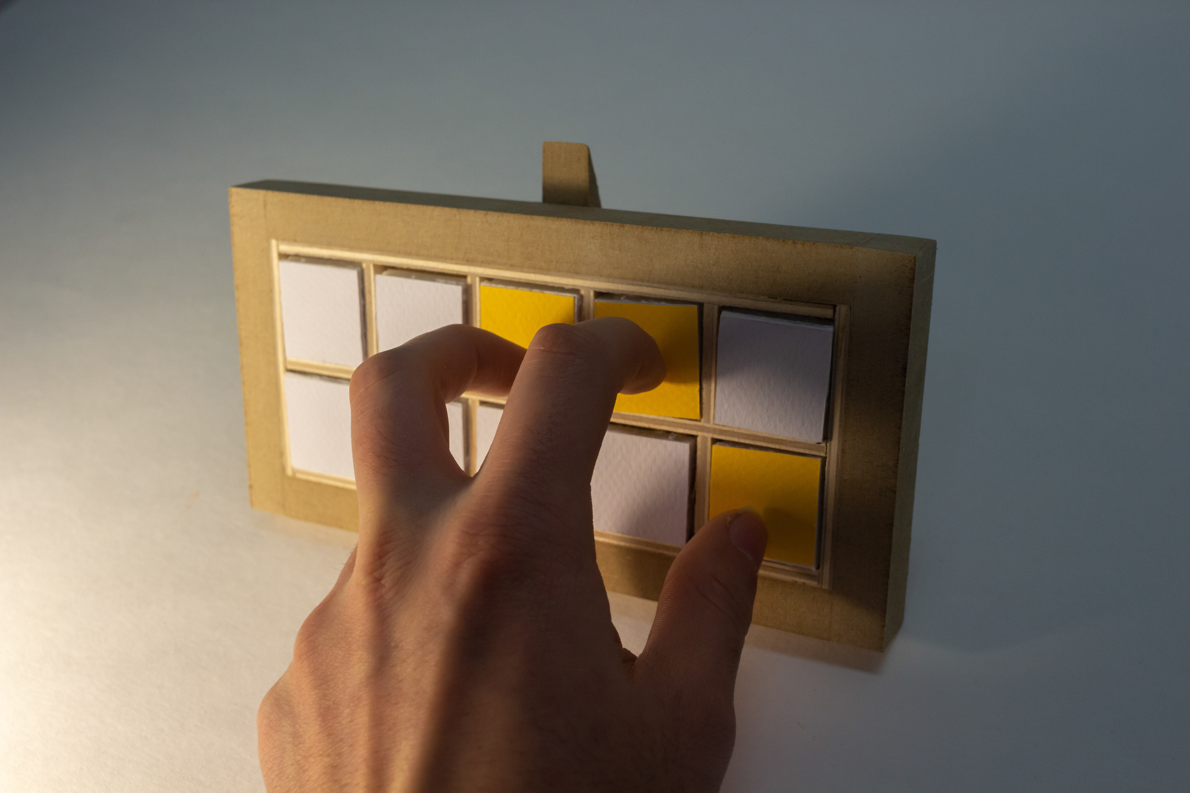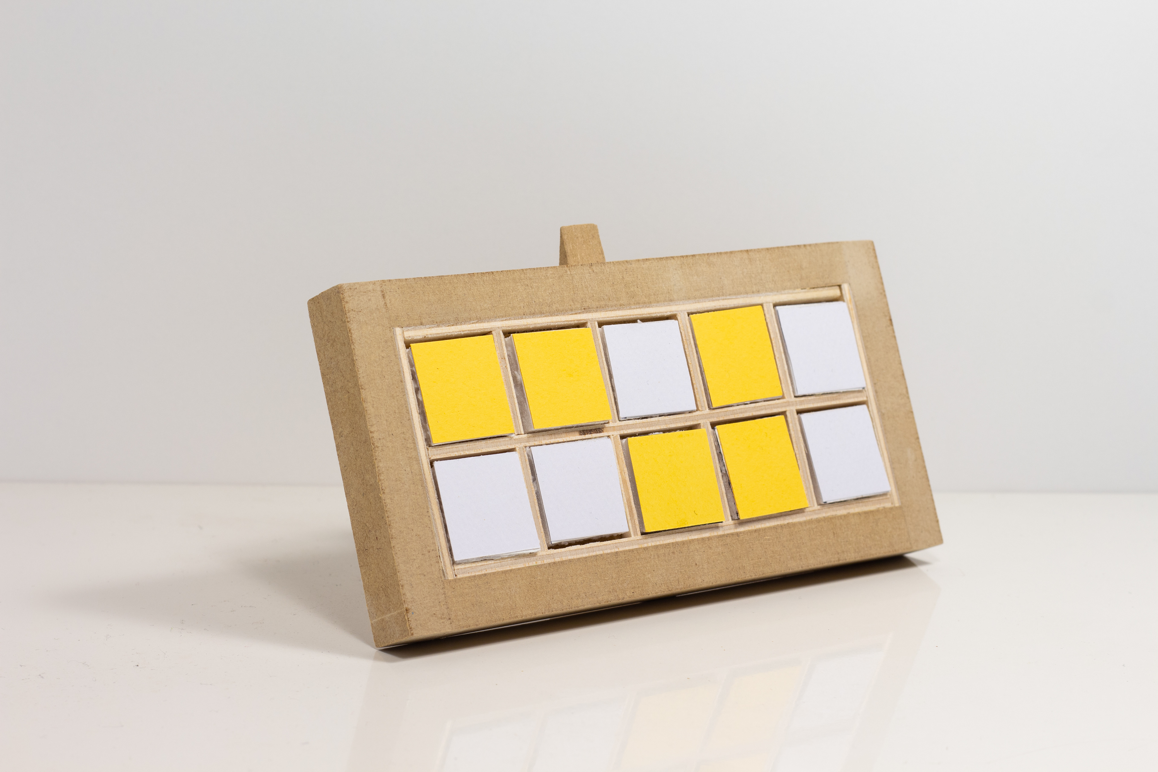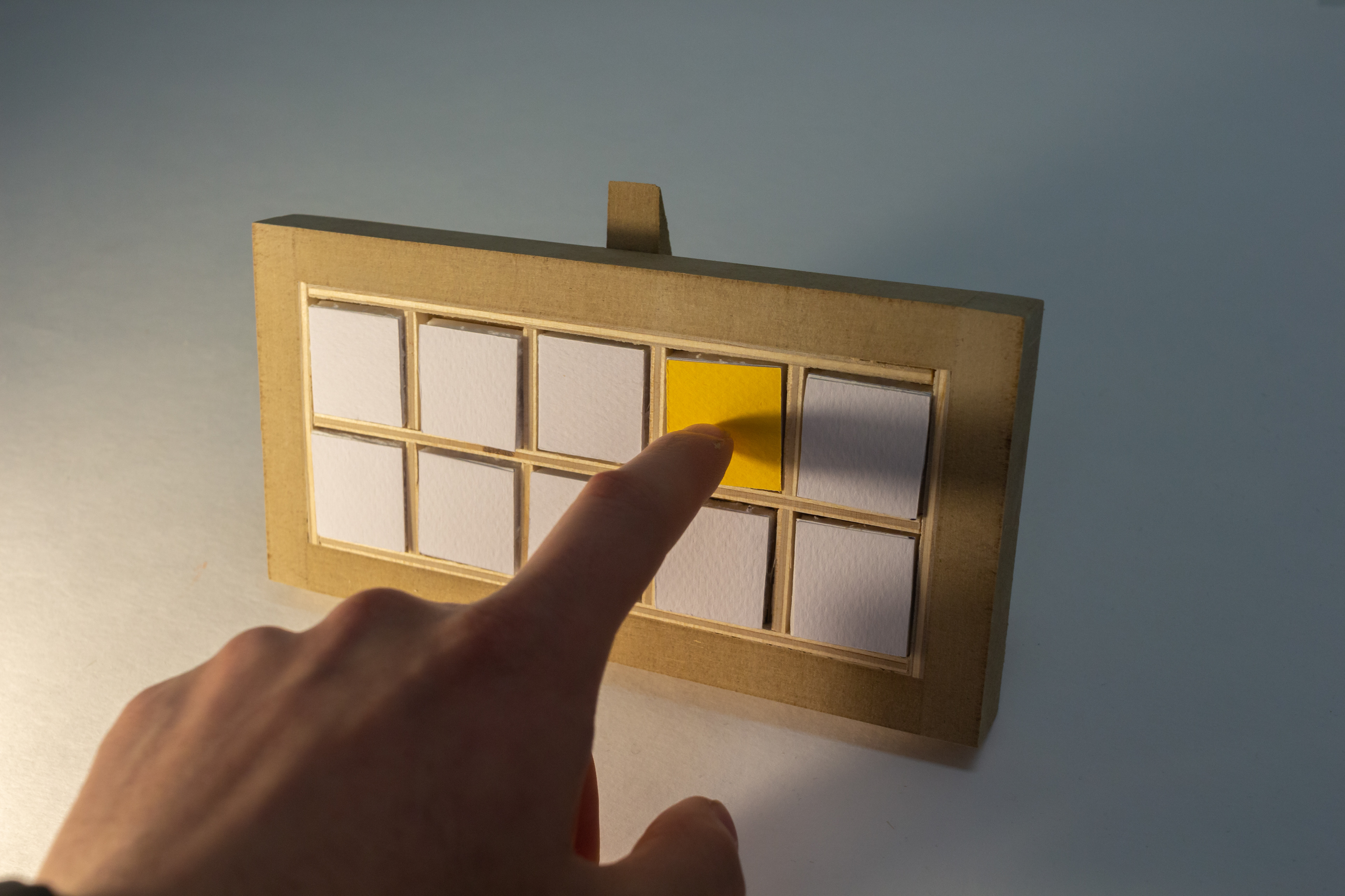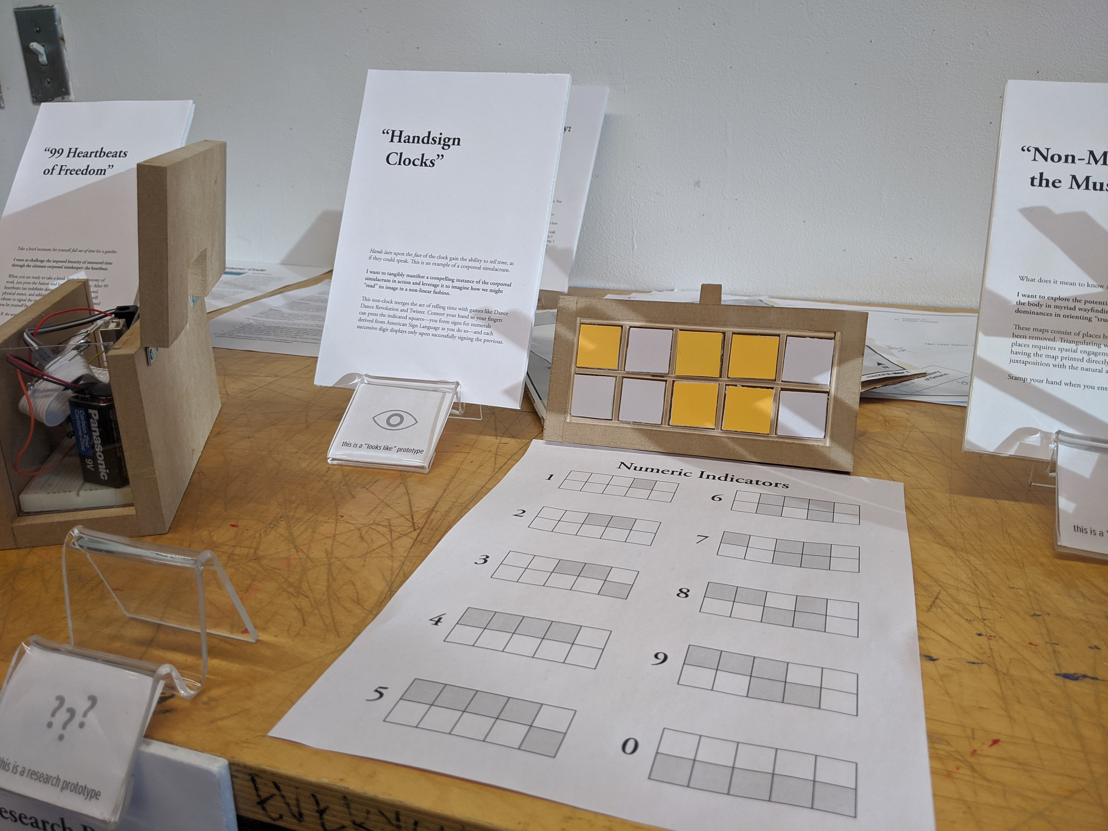 An alternative way of signifying time, on a clock face with ten touch sensors. To "read" it, you have to press every lit square simultaneously, which contorts your hand into a symbol for that number (derived from American Sign Language), upon which the clock will display the next digit of time in the same manner (and so forth). Not unlike a game of Twister or Dance Dance Revolution.